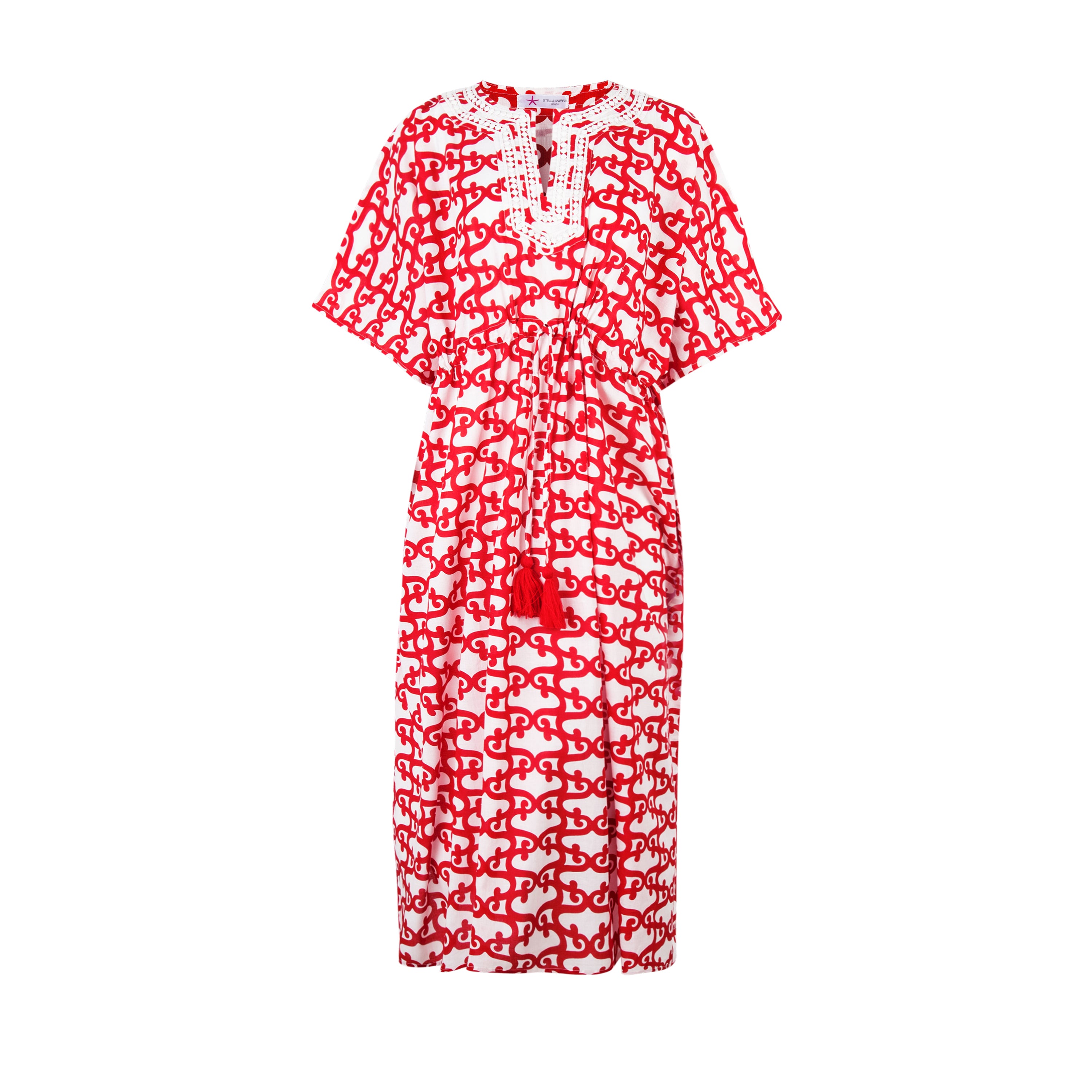 Dank des verstellbaren Zugbandes kann die Tunika nach Belieben figurbetont oder leger getragen werden. Zwei rote Bommeln am Ende des Bandes verleihen dem Design einen charmanten, verspielten Touch.