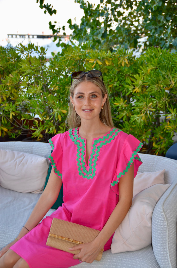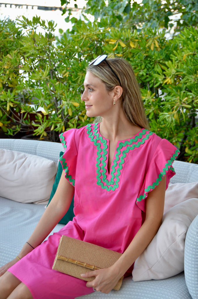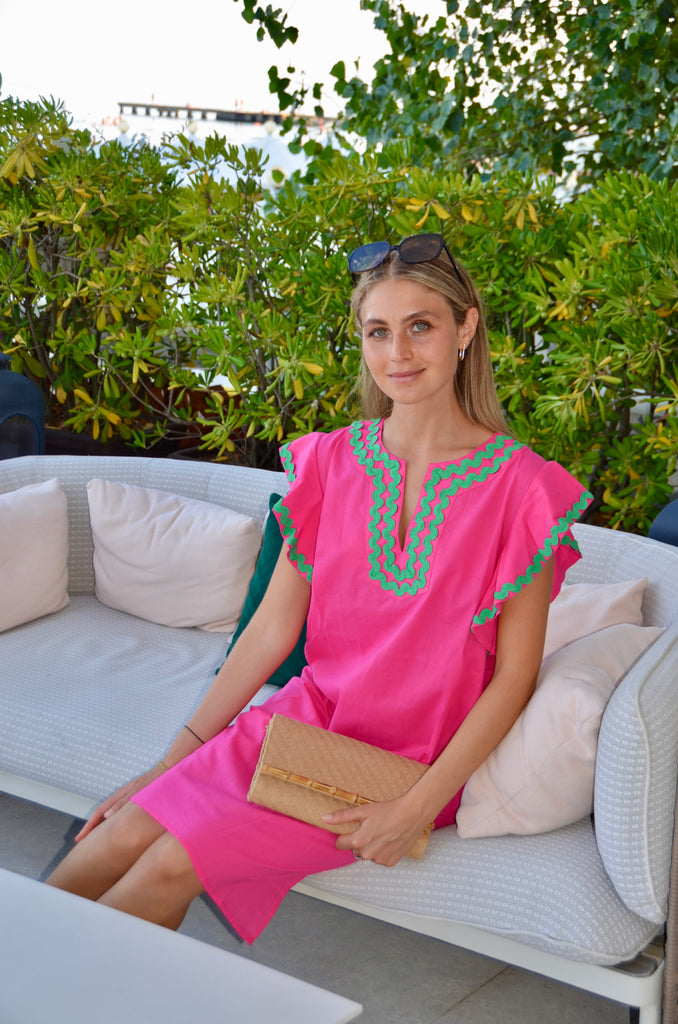 Lebensfreude pur – mit unserer „Zigzag in Zanzibar“ Tunika wird jeder Sommertag zu einem kleinen Urlaubsmoment. Aus 100 % weicher Baumwolle gefertigt, vereint sie frisches Design mit mediterraner Eleganz. Das leuchtende Pink wird durch grüne Zickzack-Stickerei am Ausschnitt und an den Ärmeln akzentuiert – ein echter Blickfang mit Gute-Laune-Garantie.